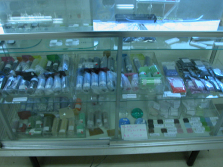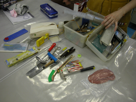 コースのご紹介をしたいと思います。 キルンワーク講座 日時:2008年11月15日(土)16日(日)※1日のみ参加可 時間:11:00〜16:00 講師:高野 恵 受講料:16,700円(設備費、材料費込み) 1日目:絞り袋を使ってガラスを描く方法とガラスを型に張り付ける方法の紹介 使用材料 棚板 セラフォーム スキガラス(0番) カラーパウダー バルコーゼ 珪酸ナトリウム溶液 紙コップ 割り箸 スプーン 絞り金口 内容 技法説明 実際に皆で作ってみる(しぼり袋の方) 受講生の人数にもよるけれど6色前後を作り、皆で使う 出来次第窯入れ(14時目標) 型にガラスを張り付ける方法のデモ。(出来たら窯入れ) ※トゥーツ・ジンスキー風作品のデモ準備 2日目 素材紹介と小技紹介 使用材料 ウェットフェルト スティックのり 木工用ボンド ホットボンド 板ガラス つまようじ リュータービット リューター ガムテープ 内容(2日目は座学がほとんど) キルンワークの基礎知識(軟化点から焼成、徐例点までのファイヤリングについて) リューターで出来ること(簡単に穴をあける方法・最近のお役立ちツールの紹介) ブラスターで出来ること(小さいピースの抜き方・機材紹介) フュージングで出来ること(アクセサリーパーツの工夫・金箔の使い方・重ね焼きでのコツ) 14時頃:窯出し・※のデモ などなどなど。 今回も内容盛りだくさんです。 キルンワーカー必見です! 是非ご参加ください。 講師の高野先生のお道具箱。 2008/11/07(Fri) 15:29:47