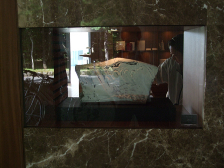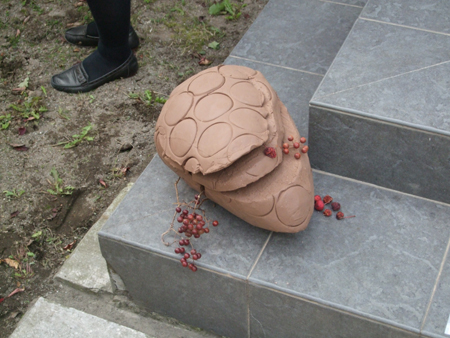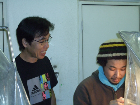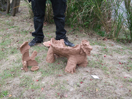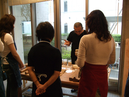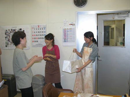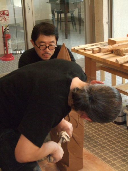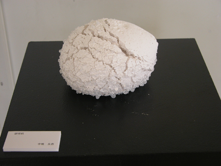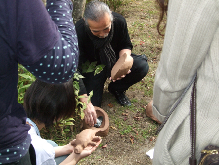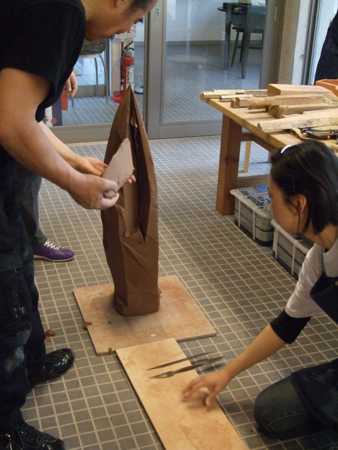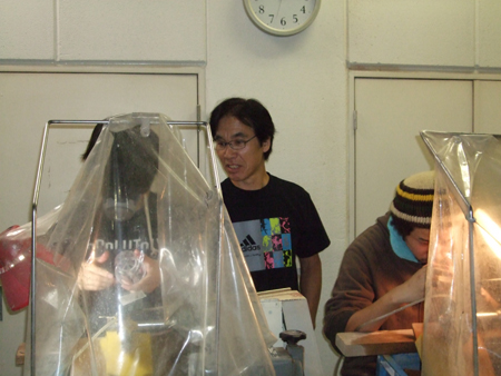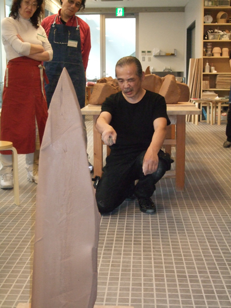 この筒状の土塊は10KG 前日に柔らかく捏ねたのですが、すでに固くなっています。 受講生一人45KGの土をつかって、粘土造形をしてもらう内容です 午前中は、スライドレクチャー☆ 実は、私は機械を操作していたため、画像がありません。あしからず お昼休憩の後は、いよいよ土に立ち向かいます まずは、三輪氏が使用している土は何種類かの土や、砂をブレンドしています。 その説明から午後はスタートです↓ それから道具の説明。ほどんどの道具は、和彦さんに合った寸法で道具を自分で作っています。 そして、おまちかね、日本刀を使用した「花冠」のデモストレーション。今回は40kgの土を使用しました。 まさに、今、土を斬る瞬間!! 静寂な中で土と刀の音だけが響きます そしていよいよ完成です あまりにも勢いよく土をこねたり、たたいたりしたので、土が窓に飛んでいます 受講生は、2日目の作品展示に向けて、デモンストレーションの後、制作に取りかかりました。 2008/10/18(Sat) 10:23:04