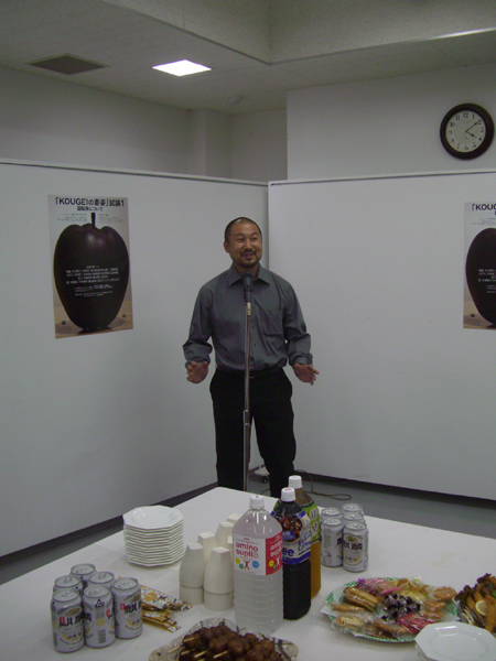「KOUGEIの素姿」試論1 回転体について が、はじまりました。 この日、陶磁から代表して、井上雅之さん、三輪和彦さん、ガラスからは、松村明那さん、金工からは、橋本雅之さん、留守玲さんが、進行は奥野の代打として今回、金子賢治さんに「回転体について」のシンポジウムが行ってもらいました。 一部、作品をご紹介します。 橋本真之さん「自転する人体」 高橋禎彦さん 「うかぶこと」 藤田敏彰さん「積層する形ー2」 三輪和彦さん「黒い夢」 三好かがりさん「角の杯 I」 小池頌子さん 「shell」 留守玲さん「錆と熱のトレー」 橋本さん「林檎」 上記以外にも素敵な作品が展示されています。 是非、観にいってください。 シンポジウムの後は、オープニングパーティーです。 司会進行は、川上さんです 挨拶は、大津さんで 奥野の長年の仕事仲間、関係者などが集まって、和やかにパーティーが行われました。 金子さん、シンポジウムの進行、ありがとうございました。 そして、これらもよろしくお願いします。 この日の夕焼けはとってもきれいでした。 2008/10/14(Tue) 19:04:54