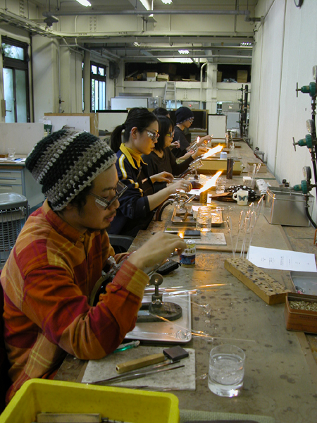 1 花のとんぼ玉 12/13(土) 10:00-16:00 講 師:磯谷 桂 対 象:初級〜中級者 受講料: ¥12,500(材料・設備費込) 花のパーツ作り中心の講座です。初めての方には易しいパーツの作り方を、中級レベルの方には複雑なパーツの作り方をお教えします。どなたでもお気軽にご参加下さい。 2 とんぼ玉のかんざし 12/20(土) 11:00-16:00 講師:守屋 孝浩 対象:初級者 受講料 ¥10,500(材料・設備費込) エアーバーナーの初級講座です。機材やガラスの扱いと初歩的なとんぼ玉の作り方を分かりやすく指導いたします。自分で作ったとんぼ玉でオリジナルのかんざしを作りましょう。 3 冬のガラスジュエリー 12/20(土) 11:00-16:00 講師:松村 明那 対象:初級〜中級者 受講料 ¥10,000(材料・設備費込) 耐熱ガラスでペンダントやピアス、指輪などを作ります。初心者の方でも、丁寧にお教えします。自分だけのオリジナルアクセサリーを作りましょう。 4 花のペーパーウェイト 11/16(日) 11:00-17:00 講師:磯谷 桂 対象:中級者〜 受講料 ¥13,000(材料・設備費込) 草花等のパーツをガラスで作り、ガラスに封じ込めたペーパーウェイトを作りましょう!花のパーツは色あざやかなモレッティのガラス棒を使用し、酸素バーナーで制作します。 5 グラス作り体験 11/16(日) 11:00-16:00 講師:松村 明那 対象:初級者 受講料 ¥16,700(材料・設備費込) 初めての方対象の初級講座です。吹きガラス技法の基本をわかりやすく丁寧に指導いたします。自分だけのオリジナルグラスをつくりましょう!!(初心者歓迎) 6 初級加工 11/22(土) 13:00-16:00 講師:守屋 孝浩 対象:初級者 受講料 ¥4,500(材料持込み・設備費込) 加工機の簡単な取り扱いを学びます。持参していただいた作品を使用して一通り加工の行程を行います。レンタル工房には必須の講座になりますので、加工機のレンタルをお考えの方は必ず受講してください。 7 パート・ド・ヴェール入門 12/13・20(土) 12/13 10:00-15:00 12/20 13:00-15:00 ※全2日間 講師:小幡 絢子 対象:初級者 受講料 ¥12,000(材料・設備費込) パート・ド・ヴェールとは、色の粉をガラスに練り混ぜ石膏の型に詰めて、電気炉で鋳造する技法です。独特のやさしい風合いのガラスが出来上がります。ペンダントやブローチなど、初心者向けの小物を作ります。講座は2日間です。 8 キルンワーク講座 11/15・16(土・日) 11:00-16:00 ※全2日間 講師:高野 恵 対象:中級者〜 受講料 ¥16,700(材料・設備費込) サマースクール「キルンワーク講座」第2弾、スキルアップを目的とした講座です。デモや講義を中心に型材の工夫や低温焼成の工夫について紹介したいと思います。学生や経験者、ある程度キルンワークを学んだ方が対象の講座となります。 2008/10/16(Thu) 13:15:03