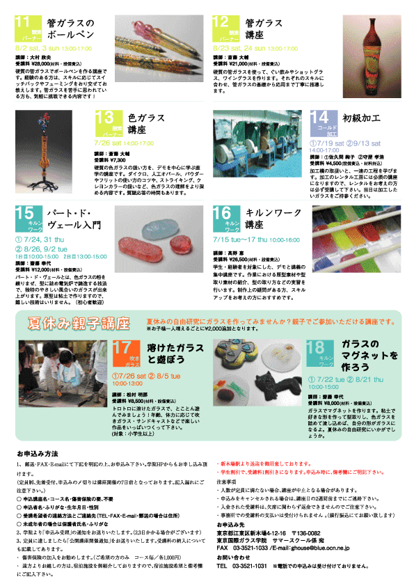 学院スタッフが是非お勧めしたい講座をご紹介します。 No.16 キルンワーク講座 日程 : 7月15日(火)・16日(水)・17日(木) 時間 : 10:00〜16:00 講師 : 高野 恵 受講料: ¥26,500(材料、設備費込み) ※学生割引あり(1割引き) ※新木場駅より送迎をご用意しております。 学生・経験者を対象にした、デモンストレーションを講義の集中講座です。 作業における原型素材や型取り素材の紹介、型の取り方の実習を行います。 制作上の疑問がある方、スキルアップをお考えの方に是非お勧めです。 スケジュール 7月15日(火) 制作A:粘土にディテールをつけた原型(3cm角程度の小さいもの)各自5個作り、それを5種類の石膏でとってみる(ブレンド、下村、ノリタケ、HCR-CA、サンエス) 粘土を取り出しガラス詰め。(詰めるのは単色) 制作B:シンプルなピースを3点作り、ガラス詰め(色は自由) A.B共に窯入れ 16日(水) 前半:原型に使える素材紹介 waxの紹介 後半:1日目に入れたものの窯出し 制作A:割り出しの際の石膏の堅さや片肌の違いを見てみる 制作B:ピースの加工、接着組み立て、石膏かけ、窯入れ 17日(木) 前半:その他素材の紹介、低温焼成の話、道具の紹介、皆さんの疑問受け付けなどなど。 後半:窯出し、割り出し グラスアートクラス代官山で講師をされてる、高野恵先生ならではの、 テクニックを余す所無くお見せする、内容盛たくさんの3日間です。 キルンワーカー必見です! サマースクールのお申し込みはこちらです。 2008/06/28(Sat) 12:19:16