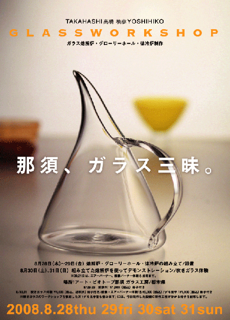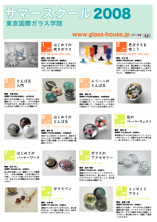 ガラス熔解炉・グローリーホール・徐冷炉制作 2008.8/28thu 29fri 30sat 31sun 8月28日(木)、29日(金) 熔解炉・グローリーホール・徐冷炉の組み立て/設置 8月30日(土)、31日(日)組み立てた熔解炉を使ってデモンストレーション/吹きガラス体験 ※30,31日は、エアーバーナー、酸素バーナー体験も出来ます。 場所:アート・ビオトープ那須 ガラス工房/栃木県 8/28-29 受講料: ¥1,000(税込)冊子付き 8/30,31 吹きガラス体験:¥4,000(税込、送料別)冊子付き/酸素・エアーバーナー体験:各¥2,000(税込) /デモ見学:¥1,000(税込)冊子付き ※吹きガラスのワークショップを参加した方(デモ見学者も含みます)には、今回制作した設備の制作工程が分かる冊子を配布します。 資料請求はガラス学院までお問い合せ下さい。 TEL:03-3521-1031 e-mail:ghouse@blue.ocn.ne.jp www.glass-house.jp 2008/06/19(Thu) 15:57:01